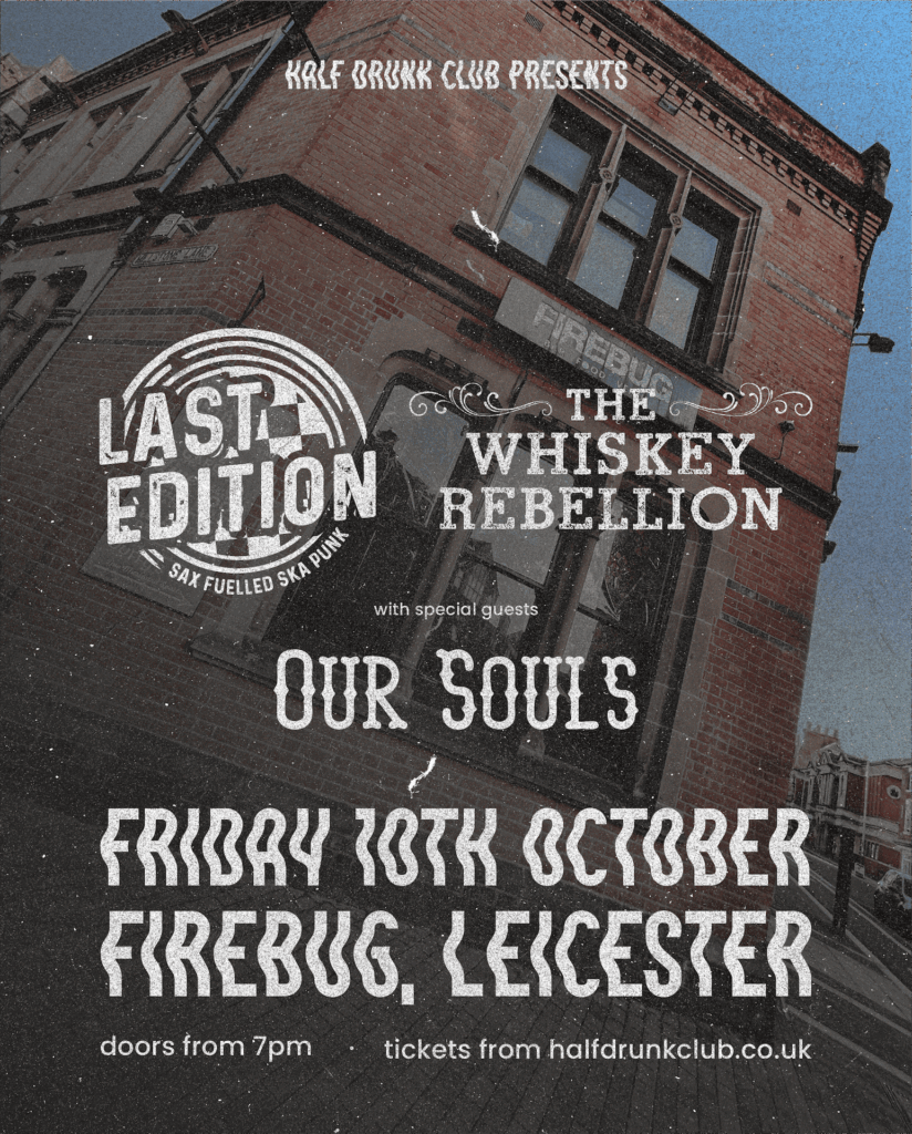 So, to keep the annual October edition of Half Drunk Club running—we have Last Edition, The Whiskey Rebellion and Our Souls completing an all-Leicester evening that’ll meander through different parts of punk music! From ska, balkan, gypsy, to melodic punk rock—this’ll be a great evening!